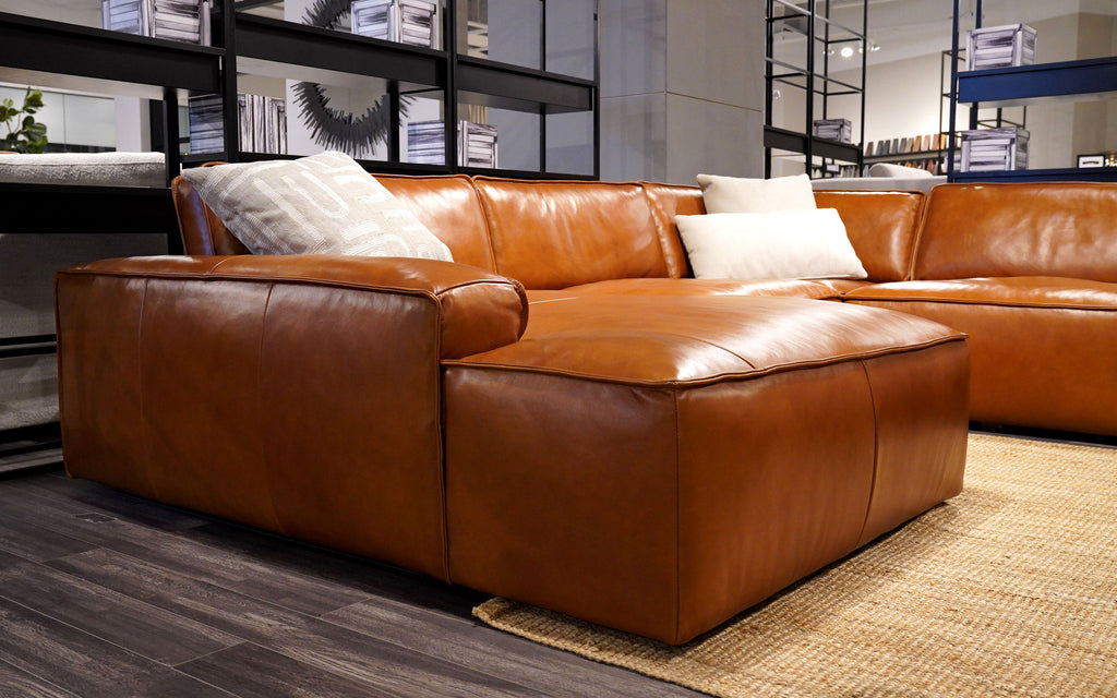 The Loto Italian sofa and lounge sectional with leather chaise is an ideal centerpiece for any home. This deep seat couch can be made to be configured as a camel leather sofa or a camel leather sectional. Add on or subtract pieces from this leather chesterfield sofa to make it the perfect fit for any spacious living room or to make it a small apartment sectional. Consider all formal living room ideas, what better way to equip yourself than with this stylish pit sectional sofa. By combining the l shaped leather sectional with the plush leather chaise lounge, it allows this deep sofa couch to also become a chaise sofa bed. Introducing MoFit Home and our Modern Motion Furniture Collection.